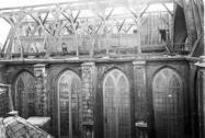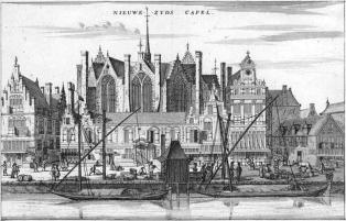 Topografie•De stad Amsterdam ontwikkelde zich vanaf de 13e eeuw aan weerszijden van de rivier de Amstel en vormde respectievelijk de wijken Oude (oost) en Nieuwe (west) Zijde. In de Oude Zijde stond de St. Nicolaaskerk, de parochiekerk van de stad, en na 1400 kwam daar de Nieuwe of Catharinakerk aan de Nieuwe Zijde bij. Het mirakel zou zijn gebeurd in een huis dat stond aan de Kalverstraat, bijna op de hoek met de Wijde Kapelsteeg aan de Nieuwe Zijde.•Reeds in 1346 werd begonnen met de bouw van een kapel op de plaats van of naast het huis waar het sacramentswonder was geschied. In oktober 1347 werd deze kapel ingezegend. De kapel brandde bij de stadsbrand van 13 april 1421 geheel af. De herbouwde kapel brandde op 25 mei 1452 bij een nieuwe stadsbrand gedeeltelijk af. De 'derde kapel' was in ieder geval in 1456 weer in gebruik en werd in 1457 uitgebreid. De kapel nam toen al vrijwel de gehele ruimte tussen Kalverstraat, Rokin, Wijde Kapelsteeg en Enge Kapelsteeg in beslag. Het is het kerkgebouw, toen reeds 'Heilige Stede' genaamd, dat tot 1908 vrijwel onveranderd op die locatie heeft gestaan.•De Heilige Stede was een hallenkerk met drie schepen van gelijke hoogte die in de west-oost richting waren gebouwd. Aan de westzijde, parallel met de Kalverstraat, lag het dwarsschip. Aan de noordzijde liep het transept door tot aan de plaats waar het mirakel had plaatsgevonden. Er was daar een min of meer separate kapel met een aparte toegang voor pelgrims die vanuit de Wijde Kapelsteeg binnenkwamen. In deze uitbouw vormde de 'heilige hoek' de plaats waar naar verluidt de oude mirakelhaard was ingebouwd. Er stond een speciaal sacramentsaltaar dat door middel van een hek van de bedevaartgangers was afgeschermd. Onduidelijk is of de oorspronkelijke mirakelhaard de stadsbranden en de kapelherbouwen daadwerkelijk heeft doorstaan. In ieder geval kreeg kapelmeester Gerrit Doodtshoofd in 1624 nog de opdracht de mirakelhaard 'gemaakt van roode steenen en boven den haart [...] een klijn schoorstientje tegen een pilaar aen' weg te breken.•De Heilige Stede werd vlak na de alteratie op 29 mei 1578 gestormd en is kort daarna voor de katholieke eredienst gesloten om voor de gereformeerden als gebedshuis, spoedig ook Nieuwe Zijdskapel genoemd, dienst te doen, tot aan de sloop in 1908 (zie ‘Bouwvallige Heilige Stede moest verdwijnen’).•Na de sluiting van de kapel in 1578 werden de (liturgische) objecten met betrekking tot het mirakel enkele jaren bij particulieren bewaard. Een huis en later de sacristie (van de oorspronkelijke Begijnhofkerk) op het nabijgelegen begijnhof functioneerden sinds het tweede kwart van de 17e eeuw als nieuwe huiskerk. In 1665 zijn de sacristie en het belendende pand tot een grotere schuilkerk omgebouwd. Daar vond de mirakelverering een nieuw onderdak.•De sacrale stadtopografie werd en wordt bepaald door de locatie van de heilige plaatsen (de oude en de nieuwe Heilige Stede) en de route van de middeleeuwse sacramentsprocessie, de latere heimelijke ommegangen en de 19e/20e-eeuwse Stille Omgangen. Over deze route en de Heiligeweg, zie hieronder bij Verering. Bouwvallige Heilige Stede moest verdwijnen(Tekst: Marius van Melle & Niels Wisman, Mei 2011)10 juli 1908Op 10 juli 1908 zetten de slopers van de Gebroeders A. en B. Slier de moker in de Nieuwezijdskapel op het Rokin. Het monumentale gebouw dateerde uit de 15de eeuw en was de opvolger van de Kapel ter Heilige Stede. De doorbrand verwoeste bedevaartskapel die in de 14de eeuw was gebouwd op de plaats waar zich in 1345 het Hostiewonder of Mirakel van Amsterdam afgespeeld zou hebben.“De vraag is niet wie de moord op zijn geweten heeft, maar hij is gebeurd en wij beklagen hem.” Die verzuchting slaakte dedichter Albert Verwey na zijn bezoek aan de half afgebroken Nieuwezijdskapel in de tweede helft van 1908. De slopers waren toen al goed op weg. Alleen wat muren stonden nog overeind en Verwey werd geraakt door de aanblik van de lucht door de latten van het pannenloze dak. De schoonheid ontroerde hem, zoals hij ook getroffen was door de resten van het bouwwerk omdat hij zich realiseerde wat zich eeuwenlang tussen de muren had afgespeeld.Toen de dichter de onttakelde Nieuwezijdskapel bezocht, was over de afbraak al veel gezegd – meestal een stuk minderpoëtisch.Tien jaar eerder was het allemaal begonnen met een papier dat was aangebracht op de kapelpoort aan het Rokin. “Gesloten wegens herstelling”, stond erop. Er waren er die het meteen al niet vertrouwden. Volgens een latere getuigenis van architect C.B. Posthumus Meyjes sr. was sluiting onvermijdelijk, omdat op 18 februari 1898 ‘werking’ was opgetreden in één van de koorpilaren. Stukken zandsteen waren naar beneden gekomen en de veiligheid van de kerkgangers kon niet meer worden gegarandeerd. Helemaal onverwacht kwam dat niet. Sinds mensenheugenis zaten er scheuren in de buitenmuren, die bovendien steeds meer naar binnen of naar buiten begonnen te hellen. Alle pilaren op één na stonden uit het lood. Een eerste onderzoek naar de bouwkundige staat werd na de sluiting uitgevoerd door Posthumus Meyjes sr. en zijn vakgenoot D.A.N. Margadant. De heren kwamen op 7 april 1898 met een rapport. Ze stelden vast dat het gebouw er beroerd aan toe was. Zonder er zelf écht in te geloven, wezen ze op de mogelijkheid van noodmaatregelen, zoals vervanging van de scheefste pilaren, de zware topgevels en het belastende pannendak. De gevaarlijk situatie zou ook dan blijven voortbestaan en eigenlijk wilden ze de verantwoordelijkheid voor zo’n restauratie niet voor hun rekening nemen.Juridisch steekspelIn februari 1899 besloot de kerkenraad van de Hervormde Gemeente van Amsterdam tot sloop. Op de vrijgekomen grond zou een nieuwe kerk in combinatie met winkelpanden komen. Nog dezelfde maand besloot het Koninklijk Oudheidkundig Genootschap bezwaar aan te tekenen. De heren van het genootschap beriepen zich op de historischebetekenis van het gebouw. Vooraanstaande katholieken protest